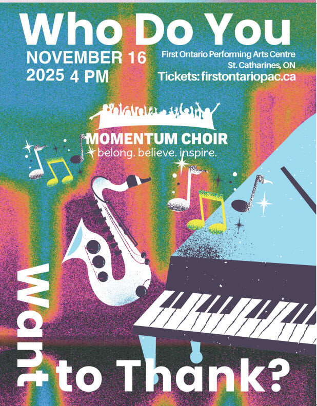 Momentum Choir’s 2025 fall performance will be held at the FirstOntario Performing Arts Centre in St. Catharines. Tickets can be purchased online or in-person from the box office of the FirstOntario Performing Arts Centre in St. Catharines. For more information and ticket purchases, please click here to visit the First Ontario PAC website.